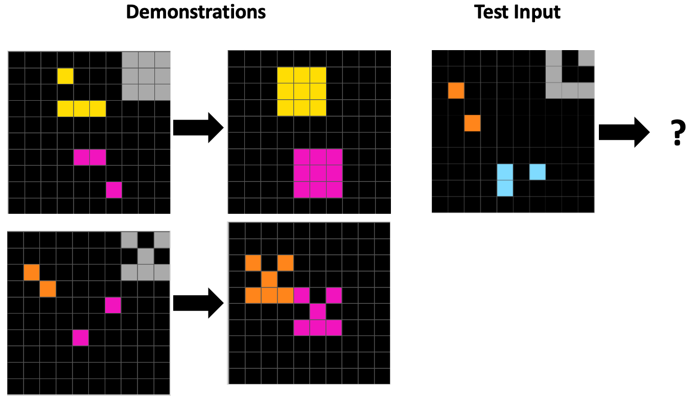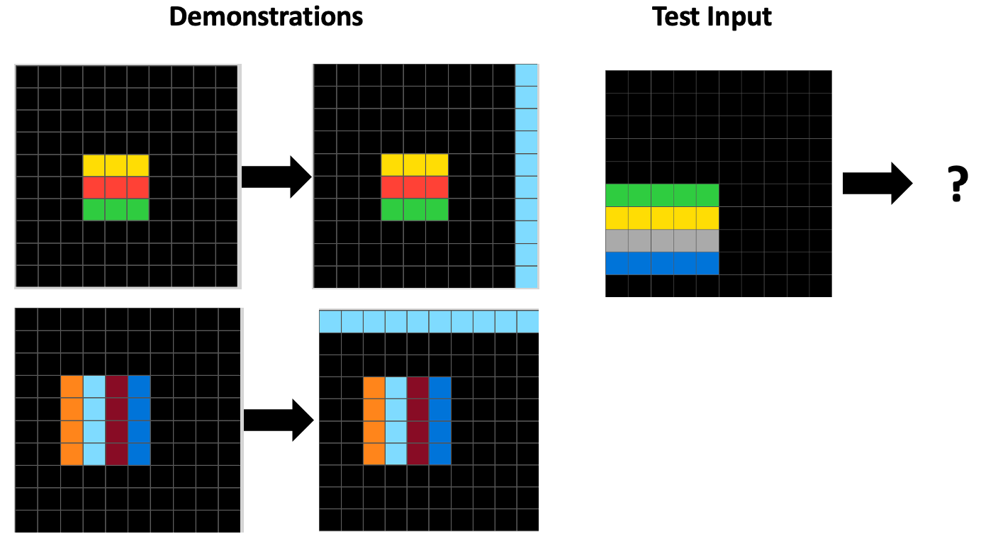 For example, here’s a task from the ARC-AGI-1 public evaluation corpus. The task gives three demonstrations of a transformation rule that maps an input grid to an output grid. The task is to apply the analogous transformation to the test input grid to generate a test output grid.