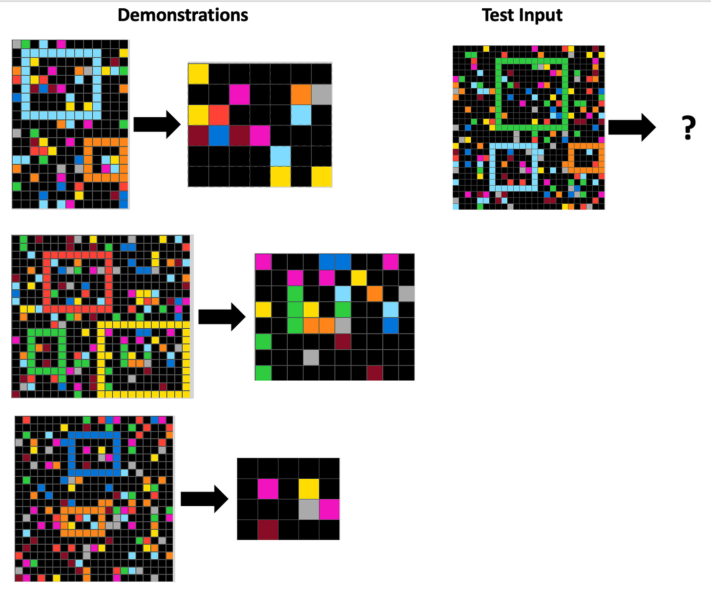 For this task, the rule is something like “Extract the sub-grid inside the largest hollow rectangle.” Intended abstractions here include “largest”, “hollow”, “rectangle”, “inside”, and “extract sub-grid”.