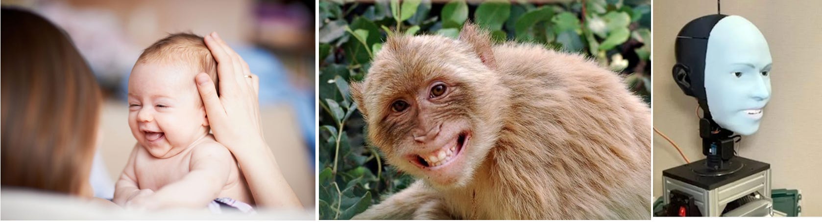 At first glance, it looks like they feature a happy baby, happy monkey, and happy robot. While the smile on the baby likely reflects happiness, it turns out that this expression in monkeys signifies not happiness but terror. And for the robot, the smile reflects not an internal human-like emotion but a programmed set of actuator functions in response to a classification of a human facial expression.