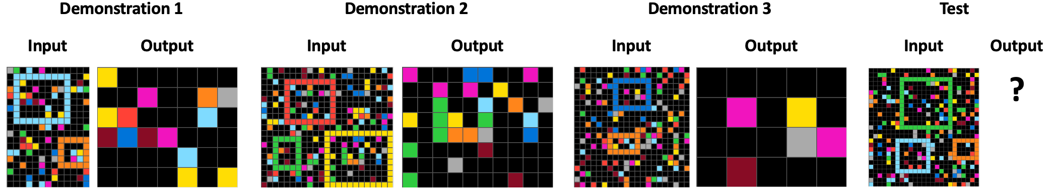 The task of the solver is to generate a new grid that applies the same transformation rule that governs the demonstrations. Here that rule is something like “extract the subgrid contained in the largest rectangle.”