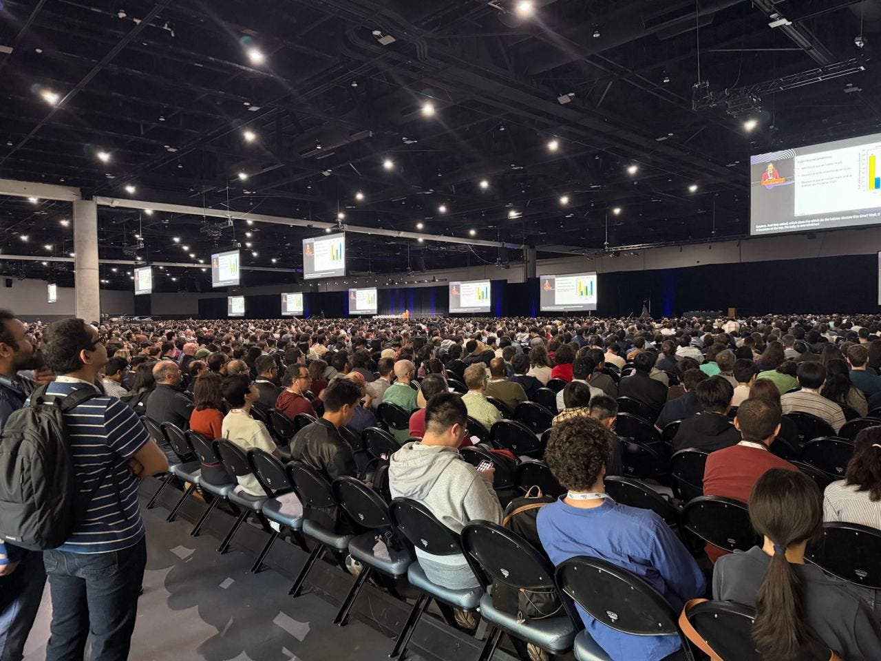 I had the great honor of being invited to give a keynote lecture at NeurIPS 20251, one of the most important annual AI/machine-learning conferences. The conference took place in San Diego, in the largest conference center I have ever seen. There were close to 30,000 people registered, and walking through the halls reminded me of walking around New York City, where on the crowded sidewalks you pass by what seems to be an unending stream of humanity. But imagine if everyone you pass on the New York sidewalk were wearing a name tag, about half of them sporting affiliations of AI startup companies all named some-random-word.ai. That was NeurIPS. It was quite overwhelming.
