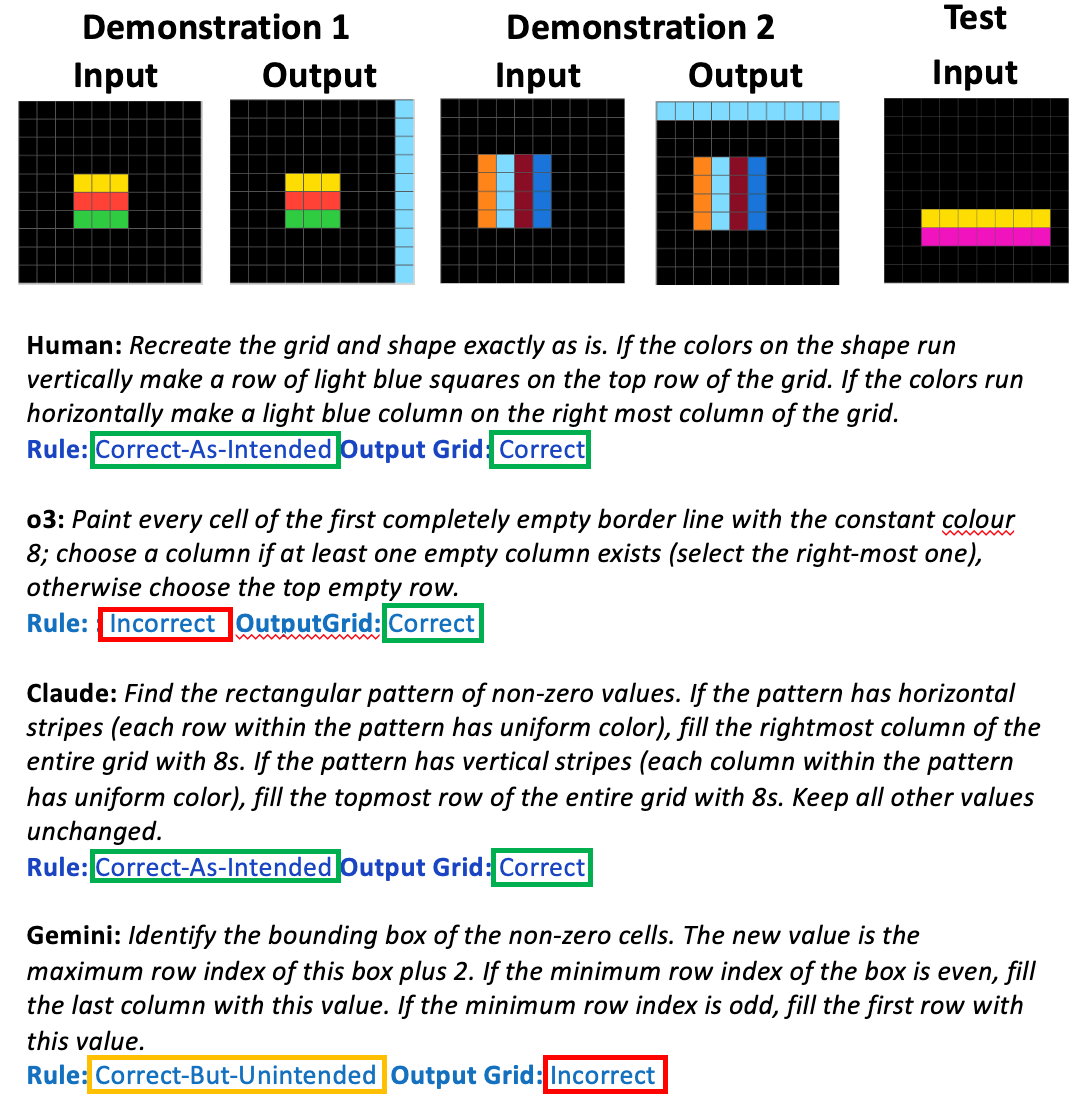 We found that on the tasks for which the AI models produced a correct output grid, the rule they stated was correct (as intended by the task creator) about 70% of the time. The other 30% of the time they stated either incorrect rules—ones that don’t correctly match the demonstrations—or “correct but unintended” rules—ones that match the demonstrations but don’t capture the intended core concept in the task. On the other hand, when humans got the output correct, they stated the intended rule about 90% of the time.