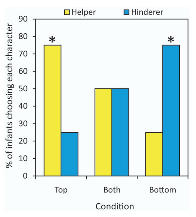 Scarf et al. recreated the puppets-on-a-hill scene, and ran experiments with three conditions: (1) Top: the climber bounces only at the top on helper episodes (as in the original experiments); (2) Bottom: the climber bounces at the bottom only on hinderer episodes; (2) the climber bounces at the top on helper episodes and at the bottom on hinderer episodes.